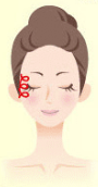 ほうれい線から表情筋に沿って、下から上へと引き上げを意識しながらこめかみまで動かします。クルクルと回すようにトリートメントするのがコツ。
